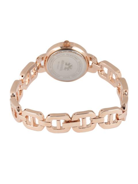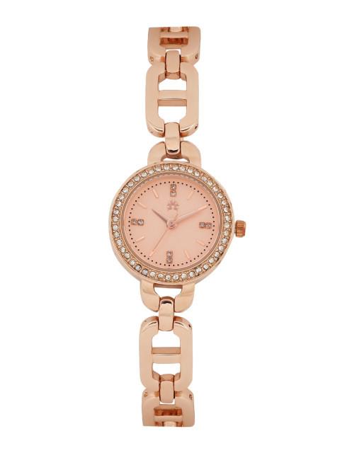 Simple watch with a roundabout case and a stainless steel back. Rose gold-toned dial with stone-studded detail. A screw to reset time. Rose gold-toned arm ornament style strap, secured with a foldover fasten. Water-safe.